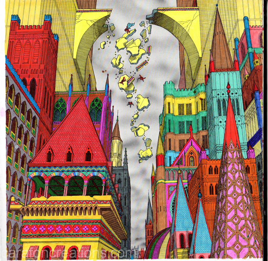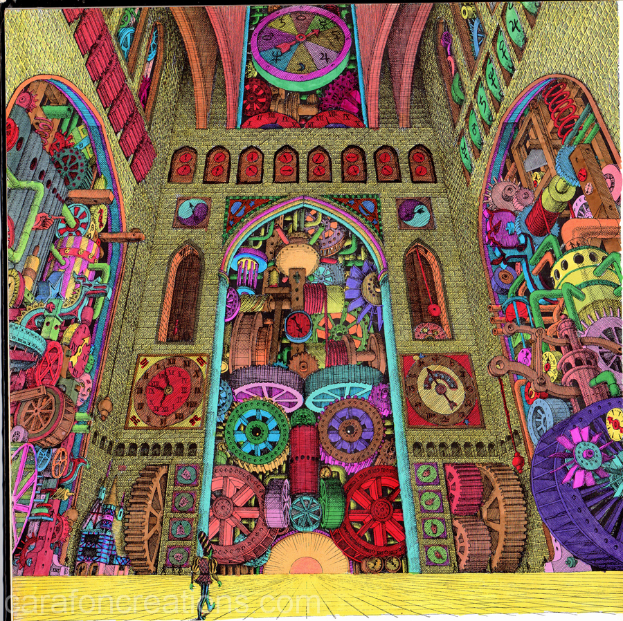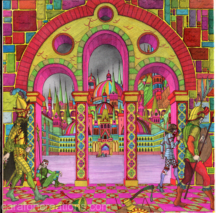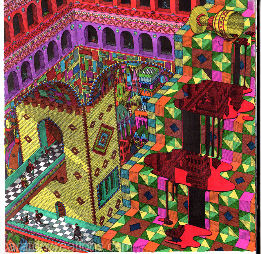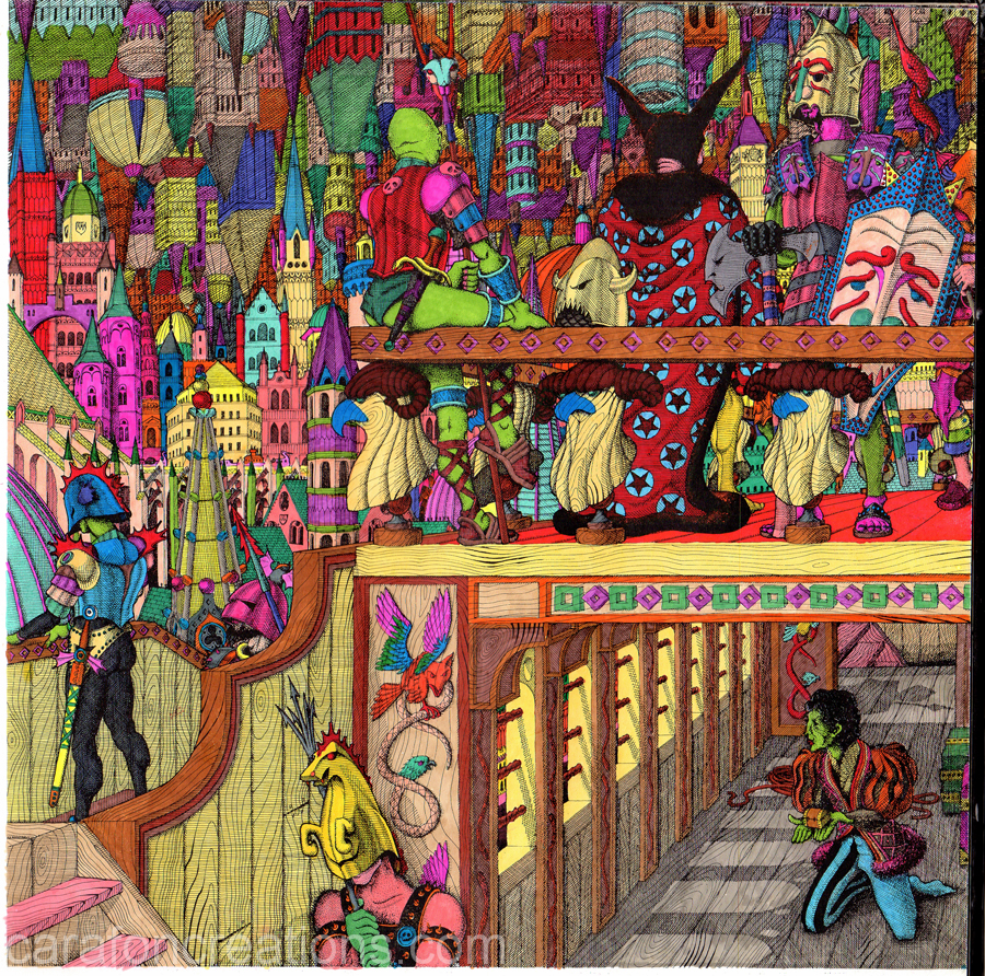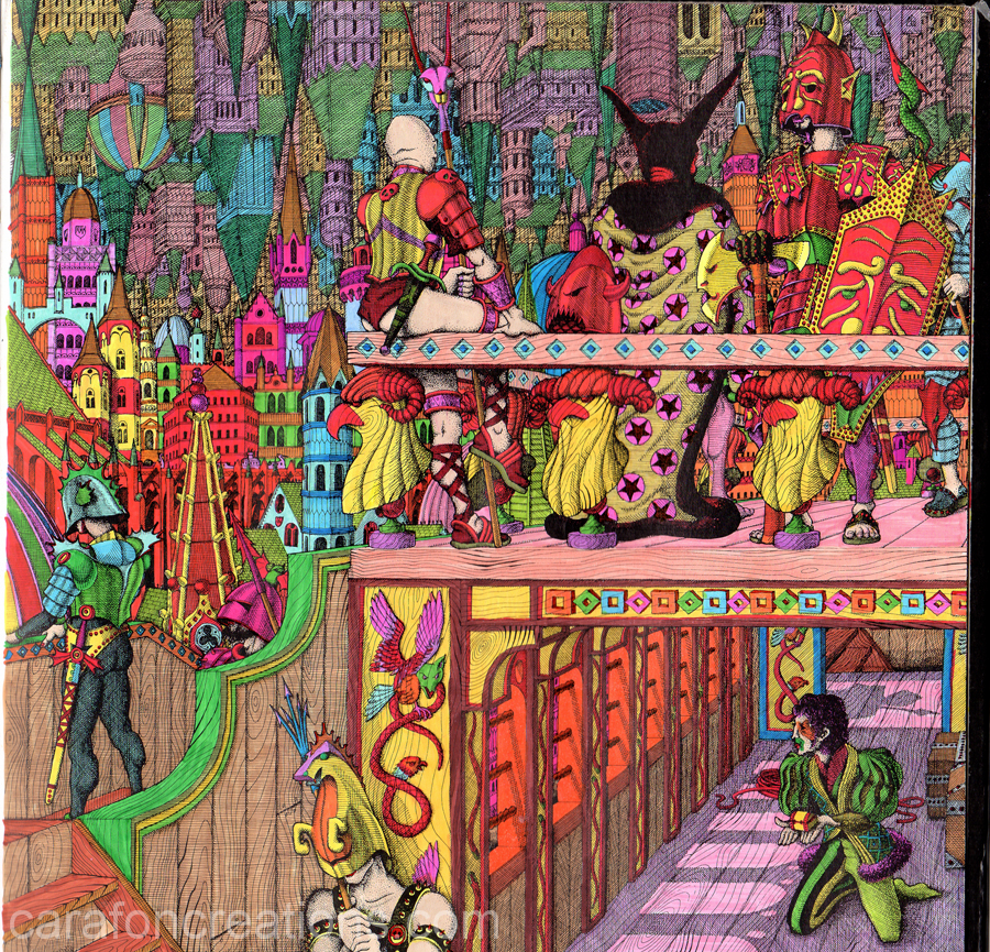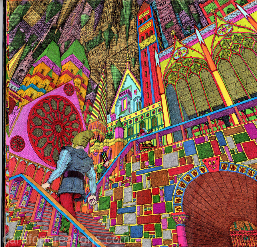 In 1982 while laid off from INCO, I found this book in the bargain bin (for $.50) at our local Woolworth’s store. When I got it home and was looking at it I thought it would make a great colouring book. I bought some magic markers (plus some more books) and began to colour it. The results were turning out really great so I let some others know about it, they went out and bought the books with some markers to do the same. As we did the work it became apparent that we each had an individual style and that it was going to take some time to finish. We thought that when we had completed it we would get together to have a celebration and an exhibition for ourselves. It never happened, but recently my brother Marc and I were interviewed by CBC Sudbury about the book. I thought I would include the scans of our work on this site, hopefully we will be able to get scans of some of the other books. You will see the differences between our interpretation and also the evolution of the work as we spent more time doing it.