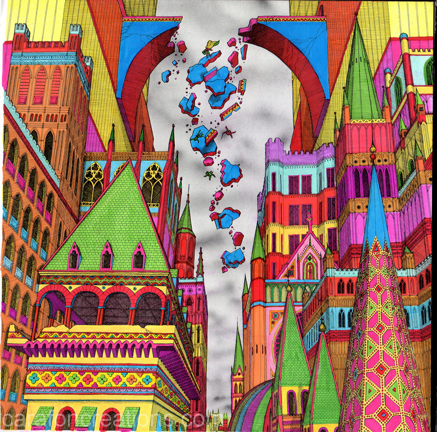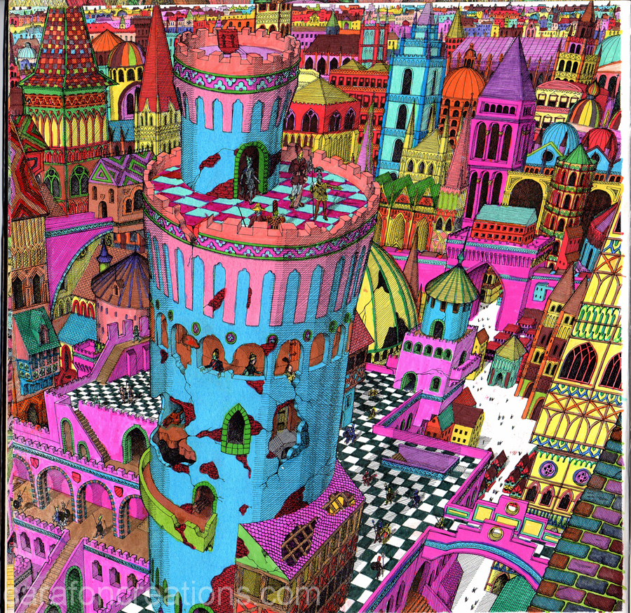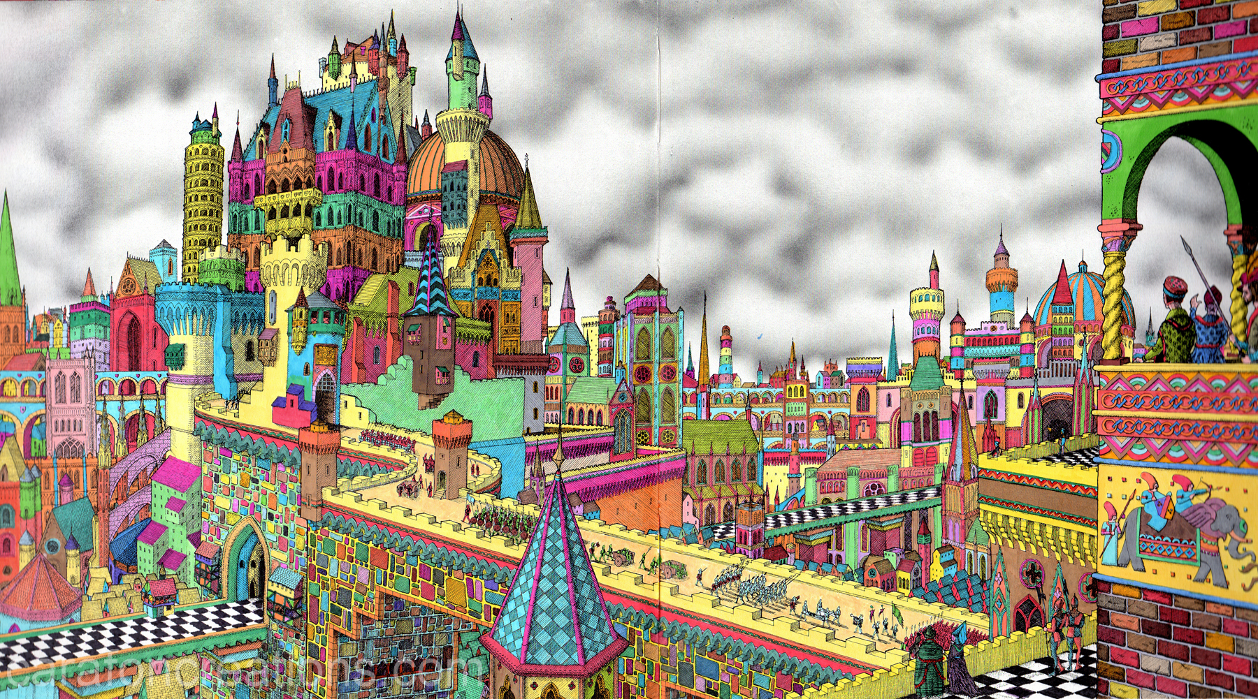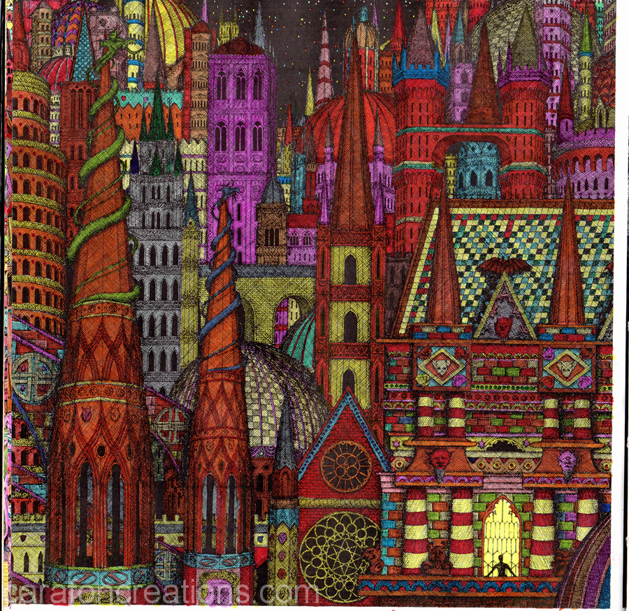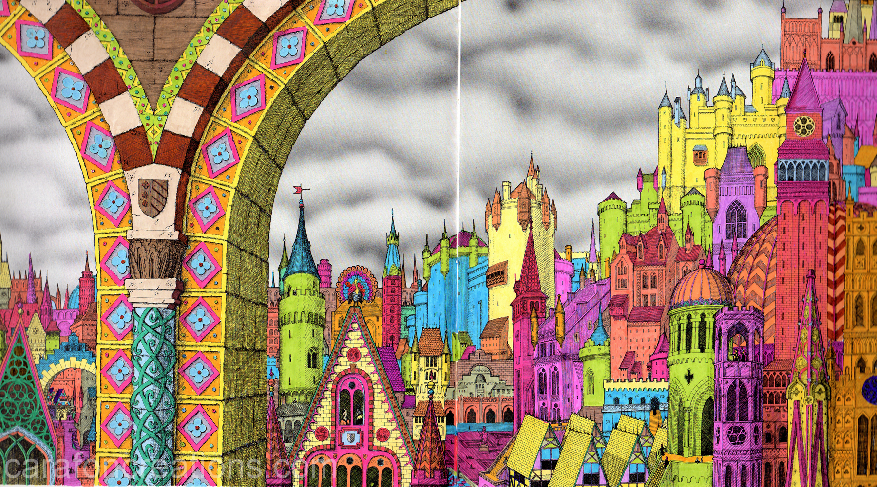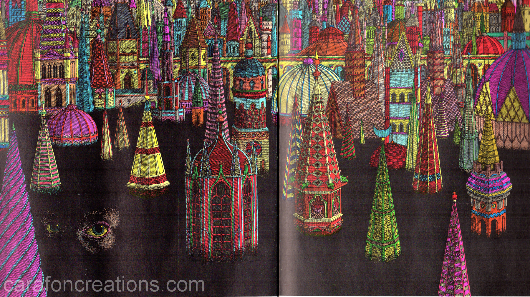 In 1982 while laid off from INCO, I found this book in the bargain bin (for $.50) at our local Woolworth’s store. When I got it home and was looking at it I thought it would make a great colouring book. I bought some magic markers (plus some more books) and began to colour it. The results were turning out really great so I let some others know about it, they went out and bought the books with some markers to do the same. As we did the work it became apparent that we each had an individual style and that it was going to take some time to finish. We thought that when we had completed it we would get together to have a celebration and an exhibition for ourselves. It never happened, but recently my brother Marc and I were interviewed by CBC Sudbury about the book. I thought I would include the scans of our work on this site, hopefully we will be able to get scans of some of the other books. You will see the differences between our interpretation and also the evolution of the work as we spent more time doing it.