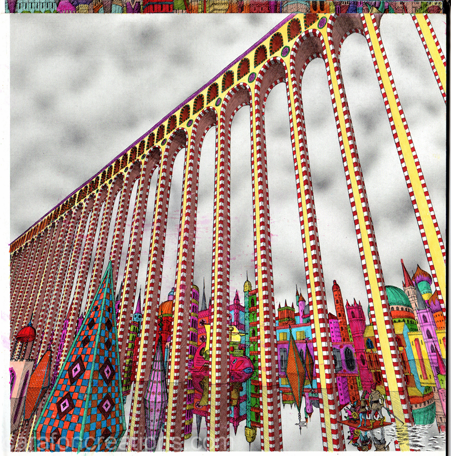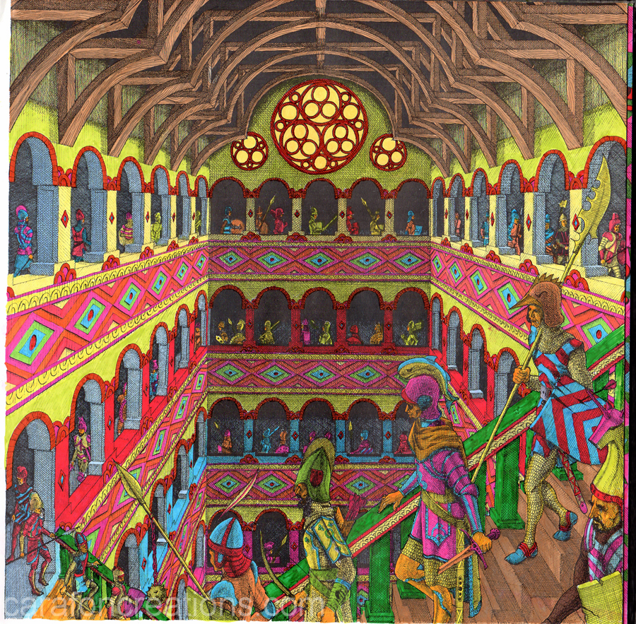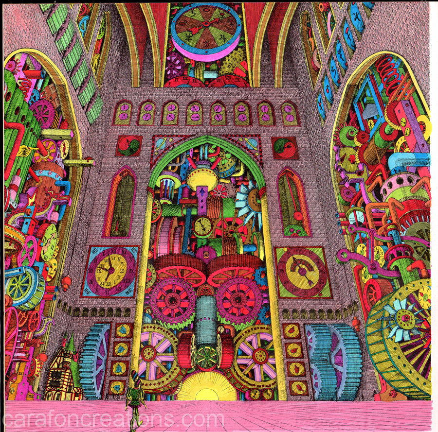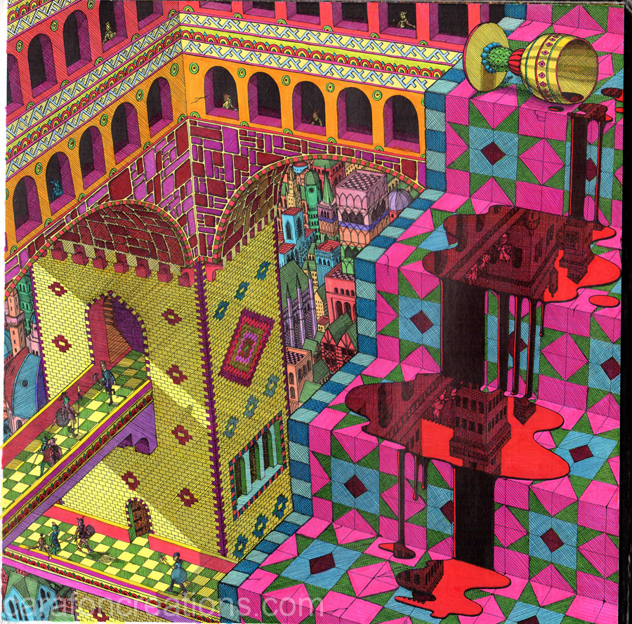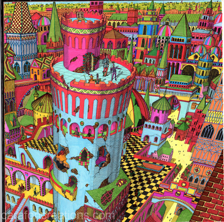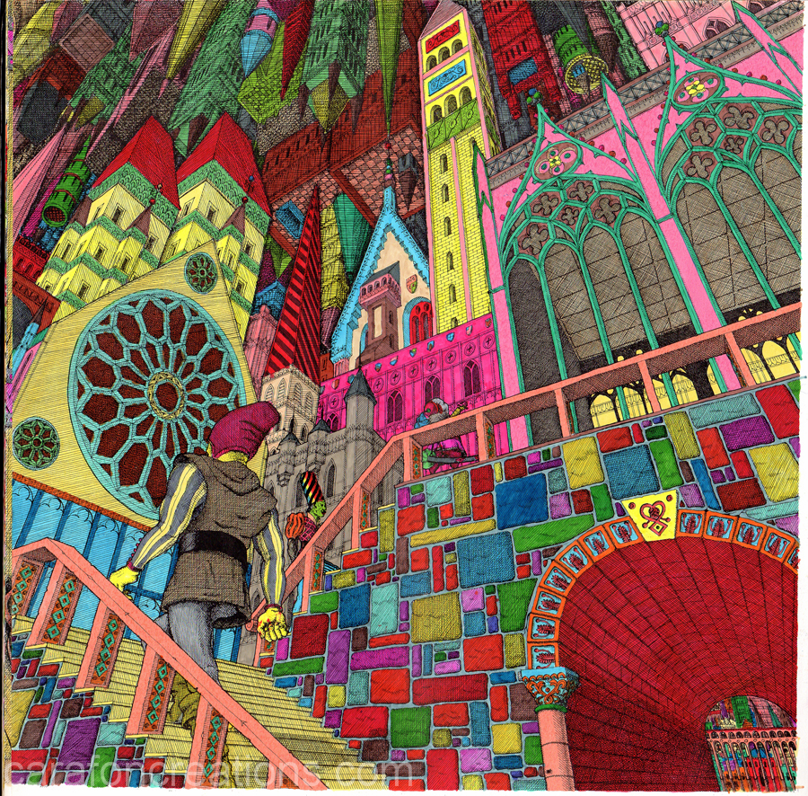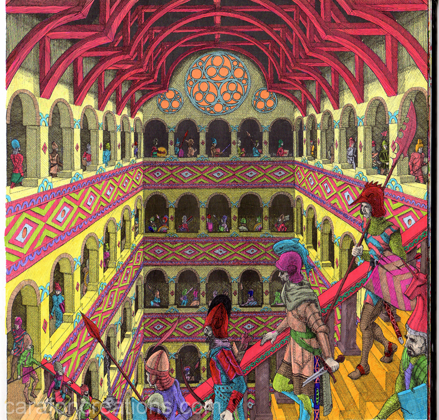 In 1982 while laid off from INCO, I found this book in the bargain bin (for $.50) at our local Woolworth’s store. When I got it home and was looking at it I thought it would make a great colouring book. I bought some magic markers (plus some more books) and began to colour it. The results were turning out really great so I let some others know about it, they went out and bought the books with some markers to do the same. As we did the work it became apparent that we each had an individual style and that it was going to take some time to finish. We thought that when we had completed it we would get together to have a celebration and an exhibition for ourselves. It never happened, but recently my brother Marc and I were interviewed by CBC Sudbury about the book. I thought I would include the scans of our work on this site, hopefully we will be able to get scans of some of the other books. You will see the differences between our interpretation and also the evolution of the work as we spent more time doing it.