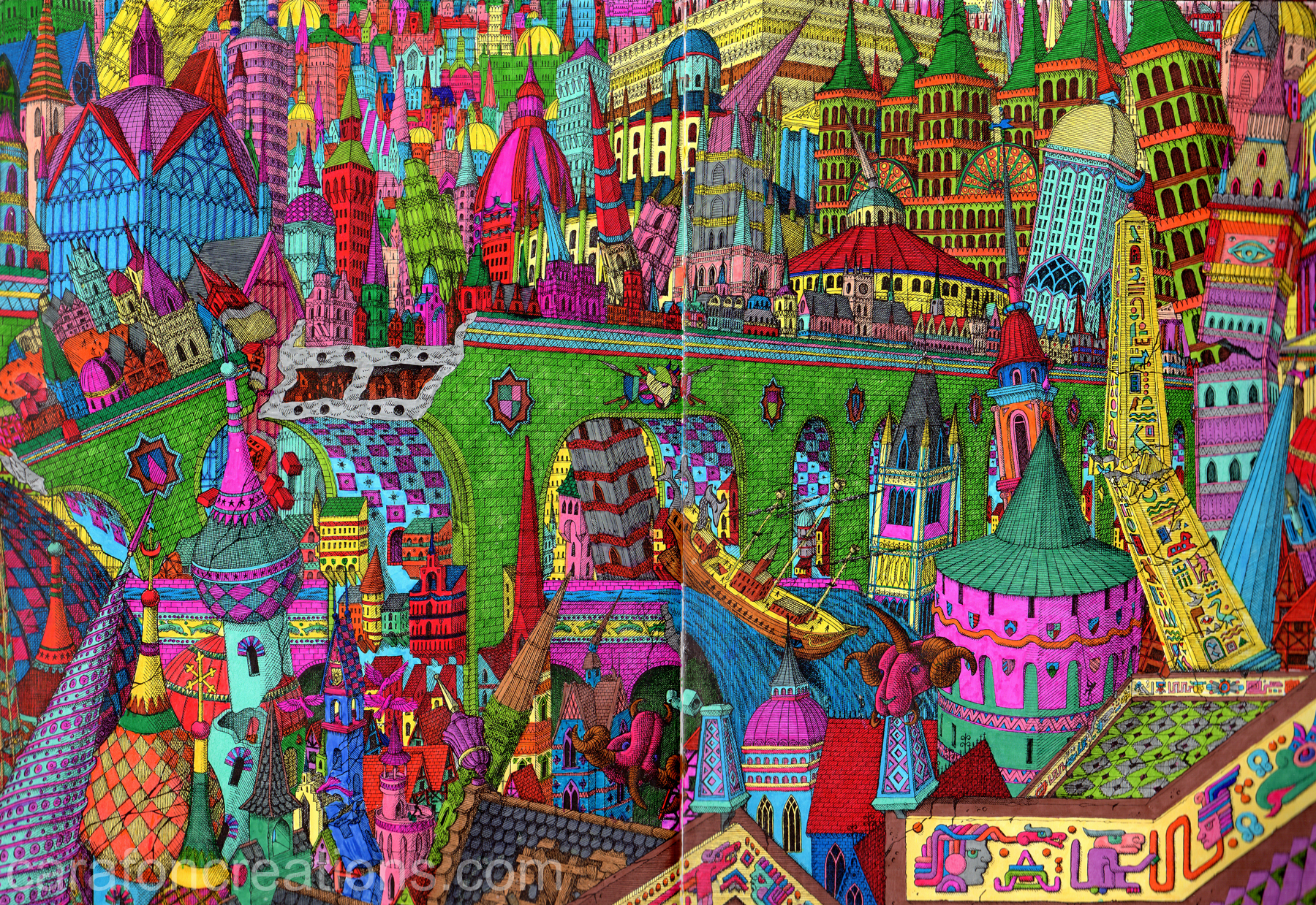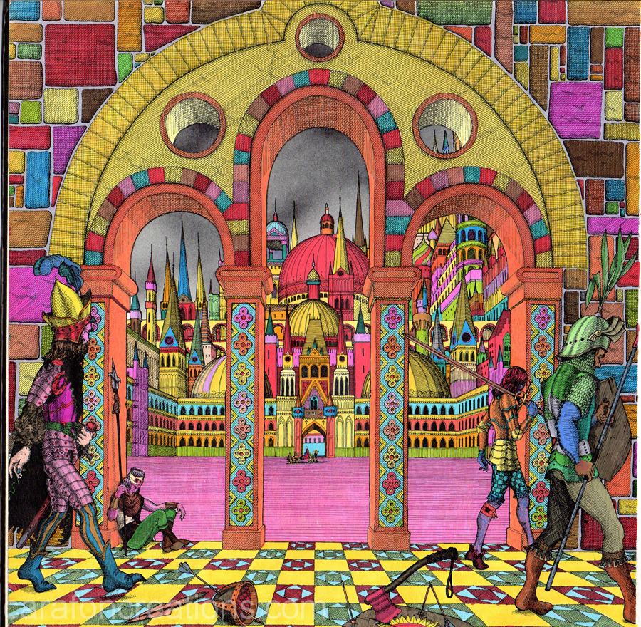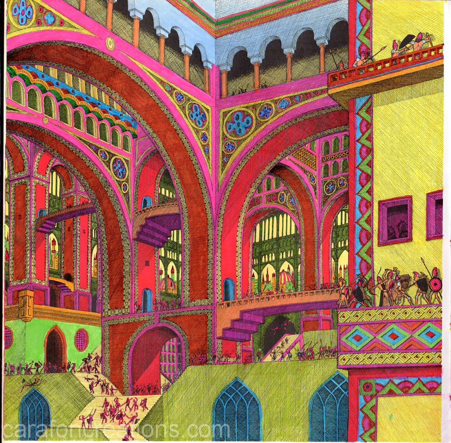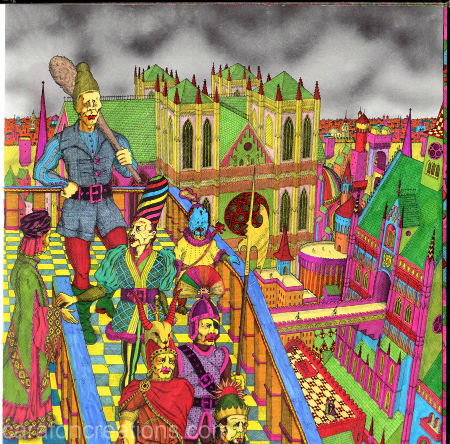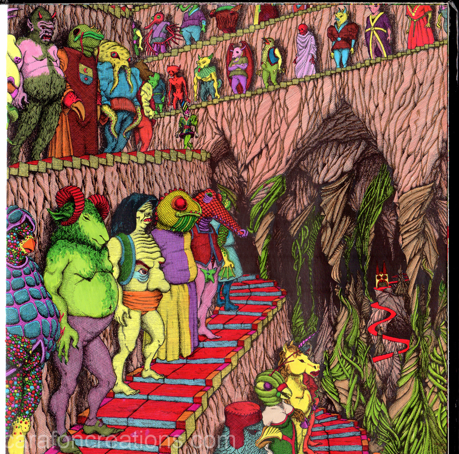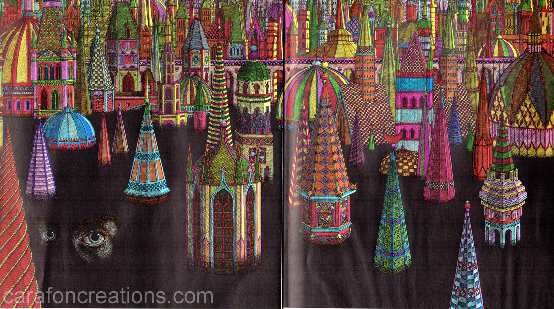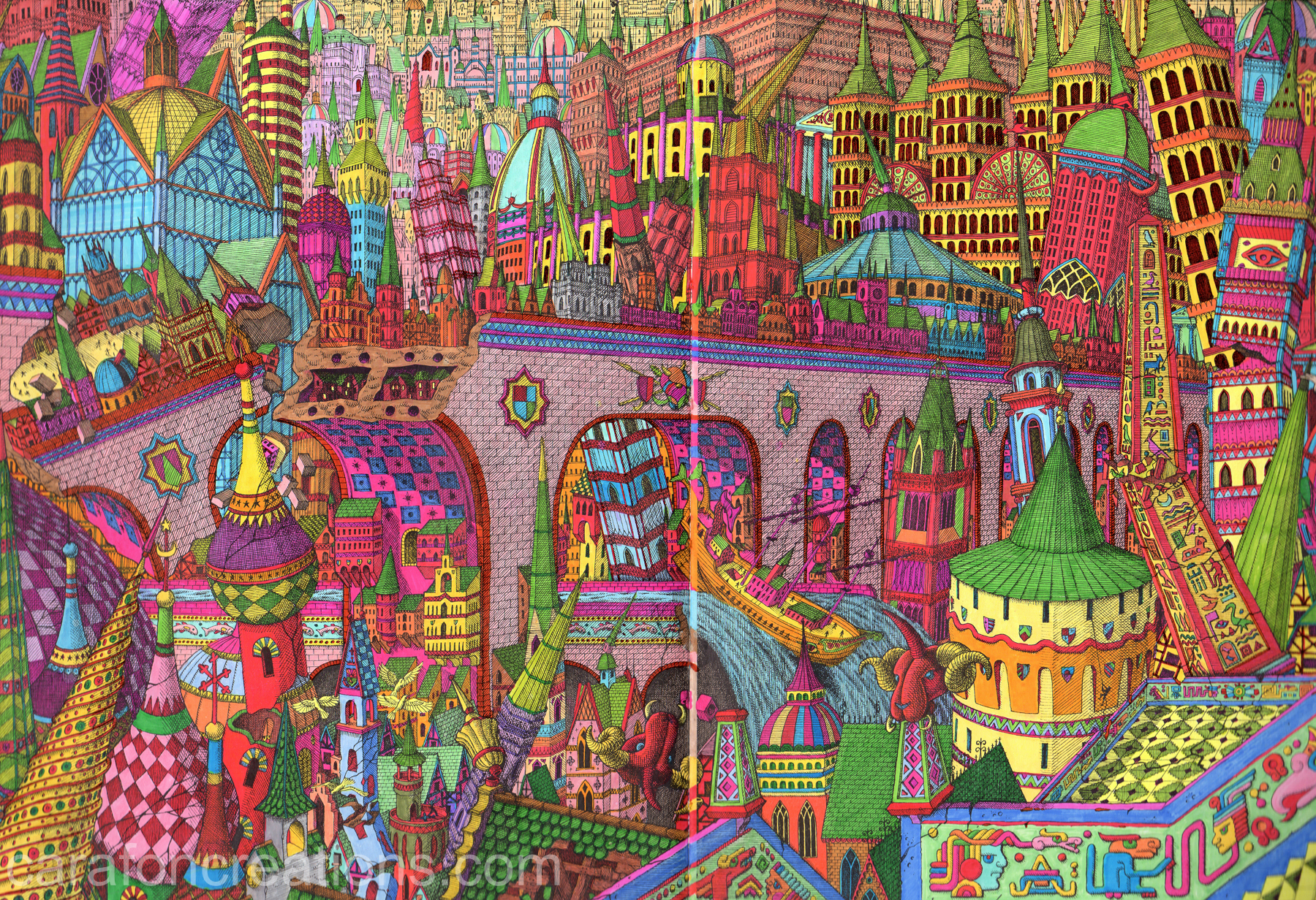 In 1982 while laid off from INCO, I found this book in the bargain bin (for $.50) at our local Woolworth’s store. When I got it home and was looking at it I thought it would make a great colouring book. I bought some magic markers (plus some more books) and began to colour it. The results were turning out really great so I let some others know about it, they went out and bought the books with some markers to do the same. As we did the work it became apparent that we each had an individual style and that it was going to take some time to finish. We thought that when we had completed it we would get together to have a celebration and an exhibition for ourselves. It never happened, but recently my brother Marc and I were interviewed by CBC Sudbury about the book. I thought I would include the scans of our work on this site, hopefully we will be able to get scans of some of the other books. You will see the differences between our interpretation and also the evolution of the work as we spent more time doing it.